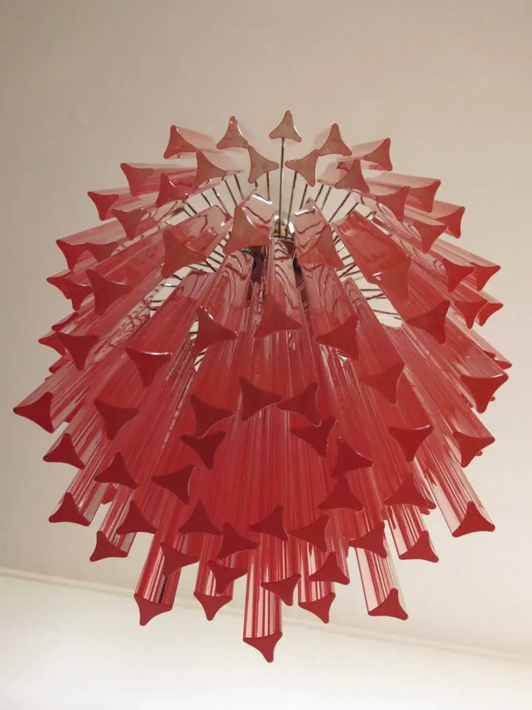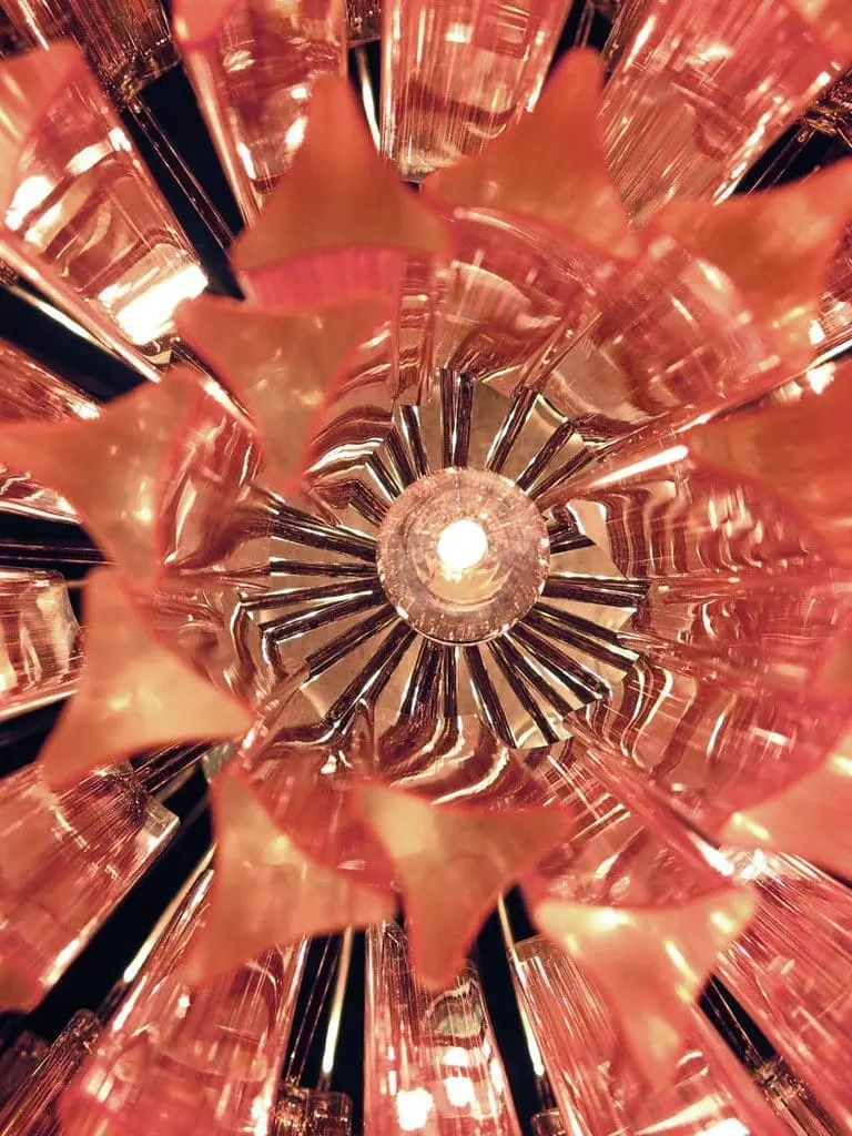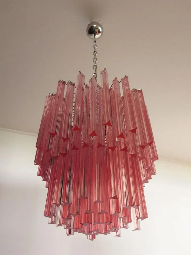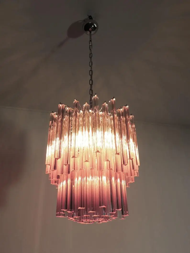Get a taste of true Italian craftsmanship with our stunning Murano chandelier. This beauty is handcrafted from 107 rose Murano prisms, each one carefully framed in metal.