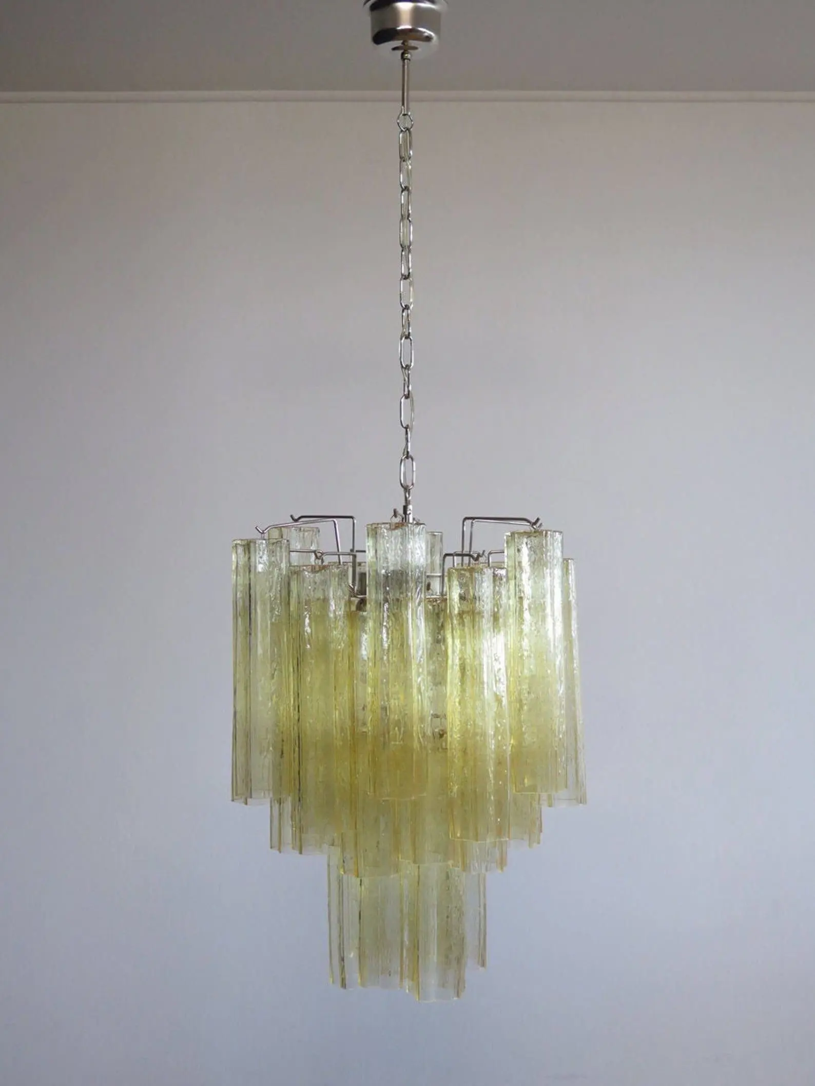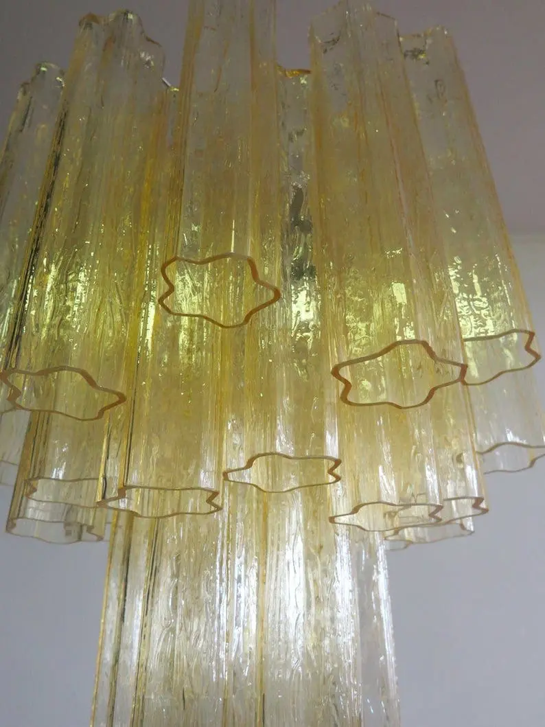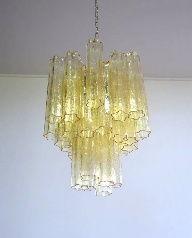 The armored polished nickel supports elegantly cradle 30 large yellow star-shaped glass tubes, creating a captivating interplay of light. Each element is a testament to the skilled artisanship of Italian glassmakers, showcasing their mastery in shaping both form and luminosity.