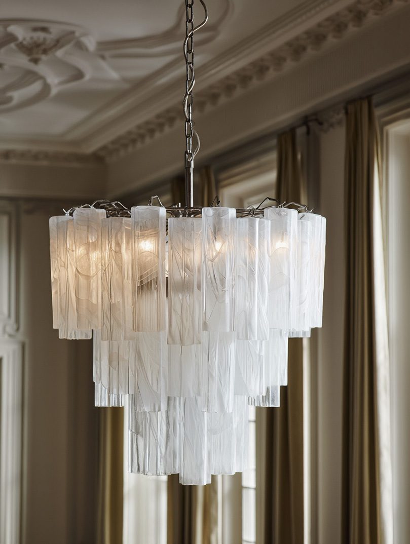 In glass production, alabaster is used to achieve a unique opacity and light transparency, which gives the glass an almost marble-like quality. The artists often use this technique to produce sculptures, lampshades, vases and, in our case, the beautiful Poliedri glass for chandeliers.